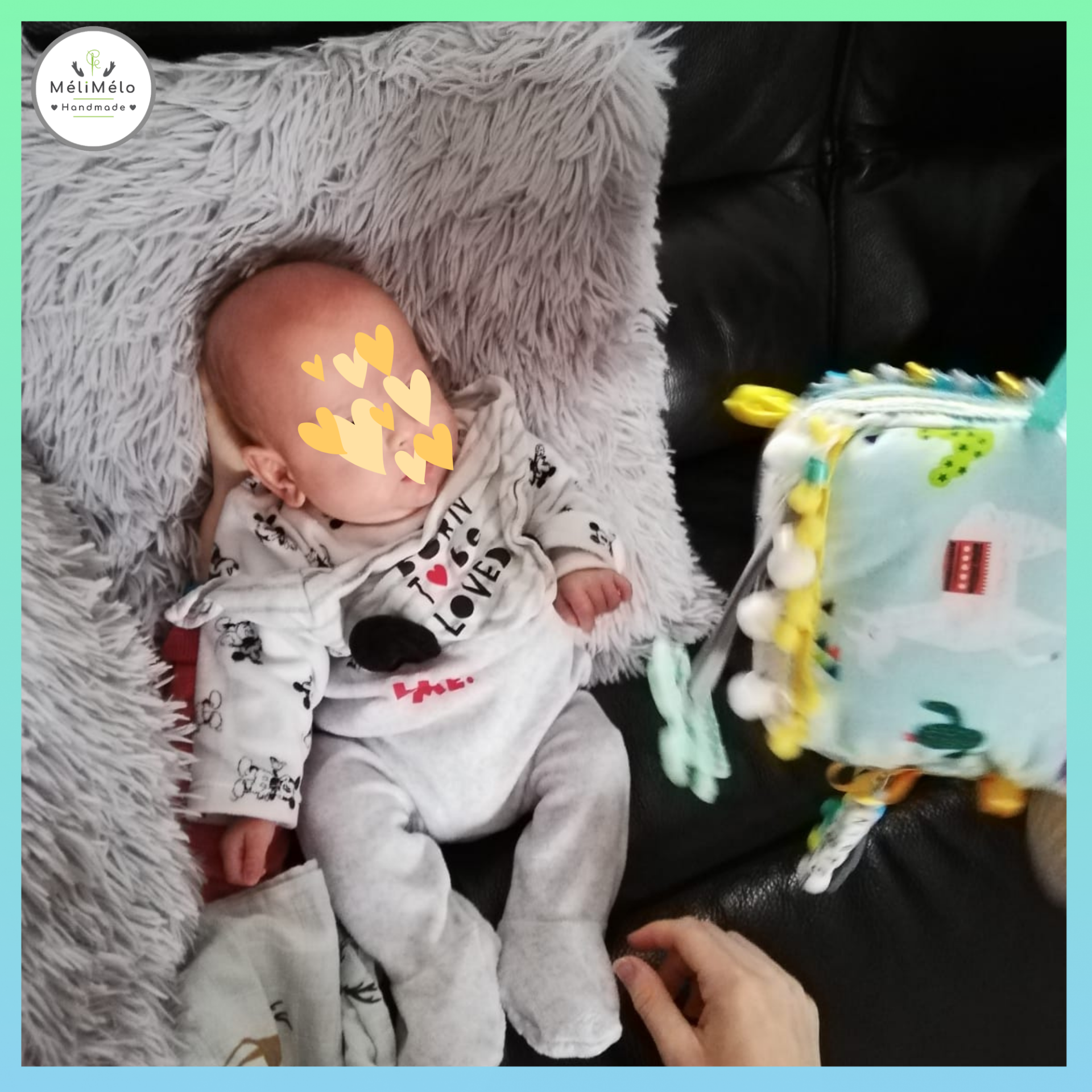 assorti à d’autres créations : balle de préhension, hochet, doudou, etc.